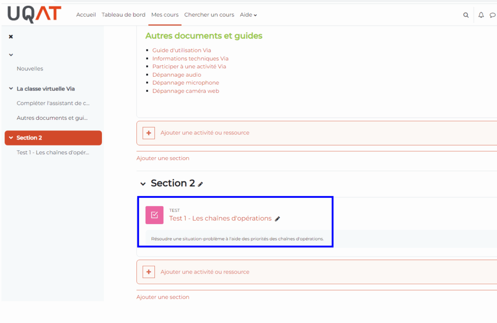 2. Voici un exemple d’activité nommée Test 1 – Les chaînes d’opération, placé sur la page du cours.