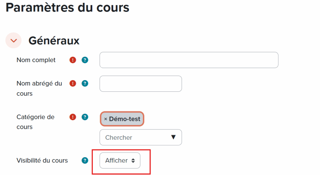 2 – Dans la section généraux, retrouver l’onglet visibilité du cours et sélectionner l’option afficher.