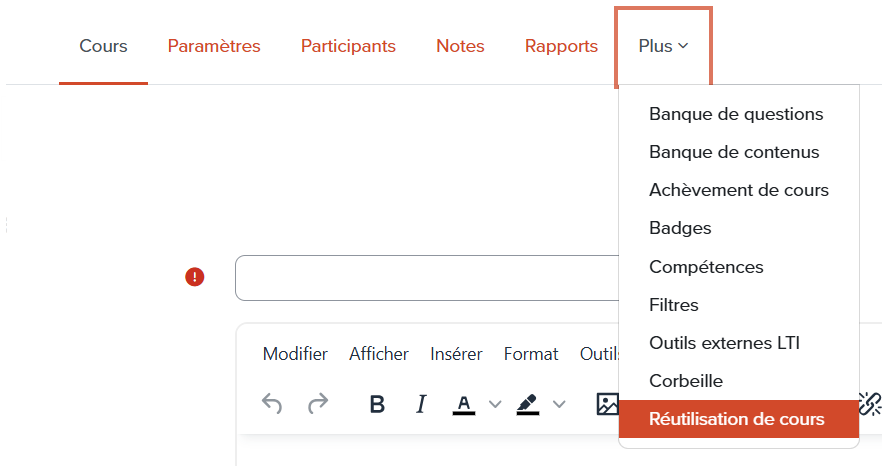 1- À partir de la page du cours qui recevra le contenu de l’importation (cours-cible), sélectionner l’onglet Plus, puis Réutilisation de cours.