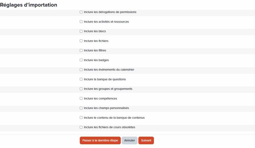 4 – Sélectionner les éléments à inclure dans l’importation, selon vos besoins. Si l’importation du cours est globale, cliquer sur Passer à la dernière étape. Si toutefois, certains éléments en particulier doivent être sélectionnés, cliquer sur Suivant.