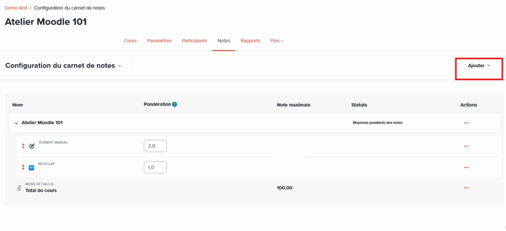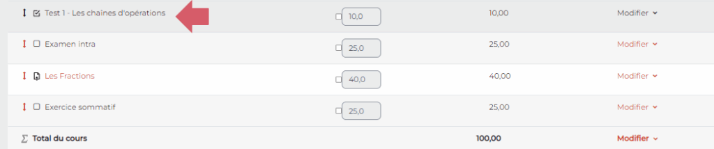 Les activités créées dans Moodle (comme les Tests) se retrouvent automatiquement dans le carnet de notes. Si leur correction se fait sur un nombre de points différent de leur valeur dans le cours, leur pondération devra être ajustée (voir section 4.2).
