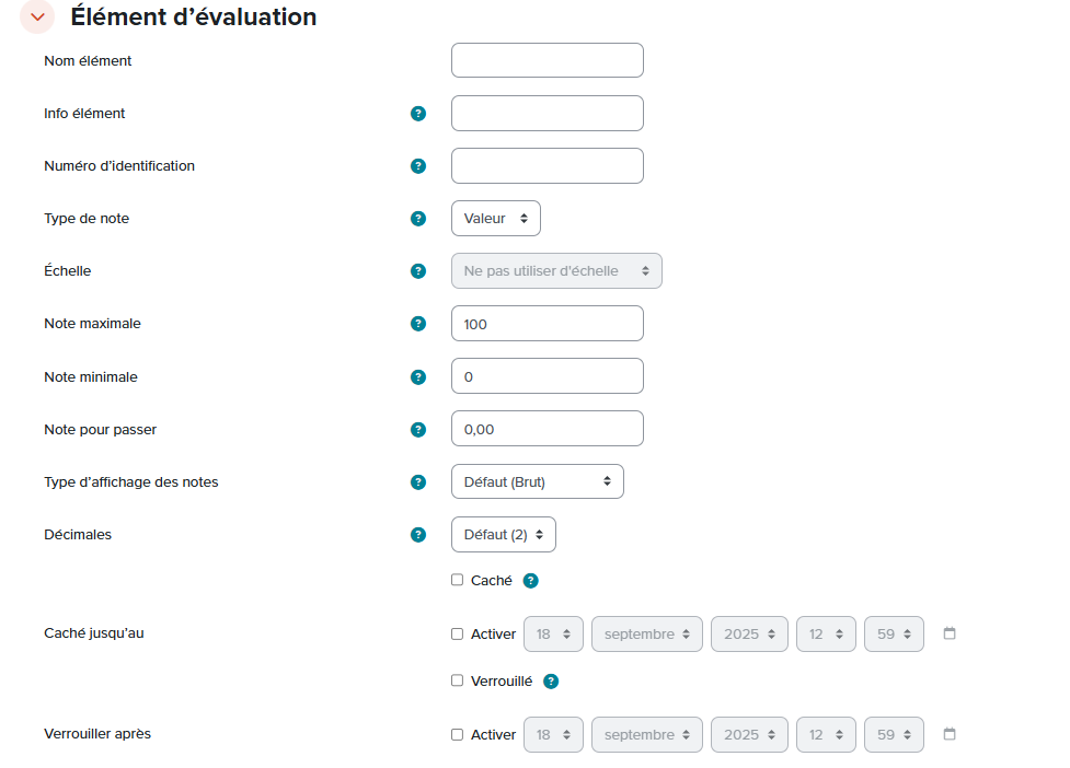 Il est possible que vous optiez pour créer manuellement dans votre carnet de notes les éléments d’évaluation. Dans ces cas, les étudiants ne complèteront pas directement dans Moodle une activité ou une évaluation telle que décrite dans la section précédente. Par exemple, si vous créez manuellement un élément d’évaluation nommé participation, examen final, etc., cela implique que le moyen de passation de l’évaluation par les étudiants ou de dépôt/correction par vous n’est pas Moodle (exemple : examen en classe, dépôt de travail imprimé en mains propres, etc.).