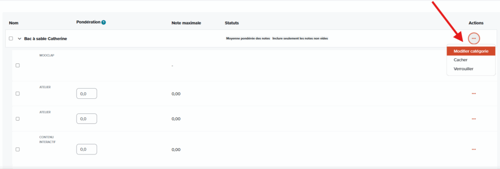 c) Sur la première ligne du carnet de note, celle où apparaît le nom du cours, cliquez sur …, puis sur Modifier catégorie :