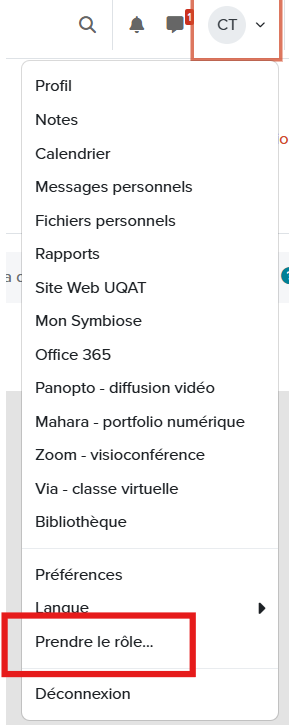 Vous pouvez utiliser l’option prendre le rôle étudiant pour constater l’aspect visuel de votre cours, selon la perspective de vos étudiant·e·s.
