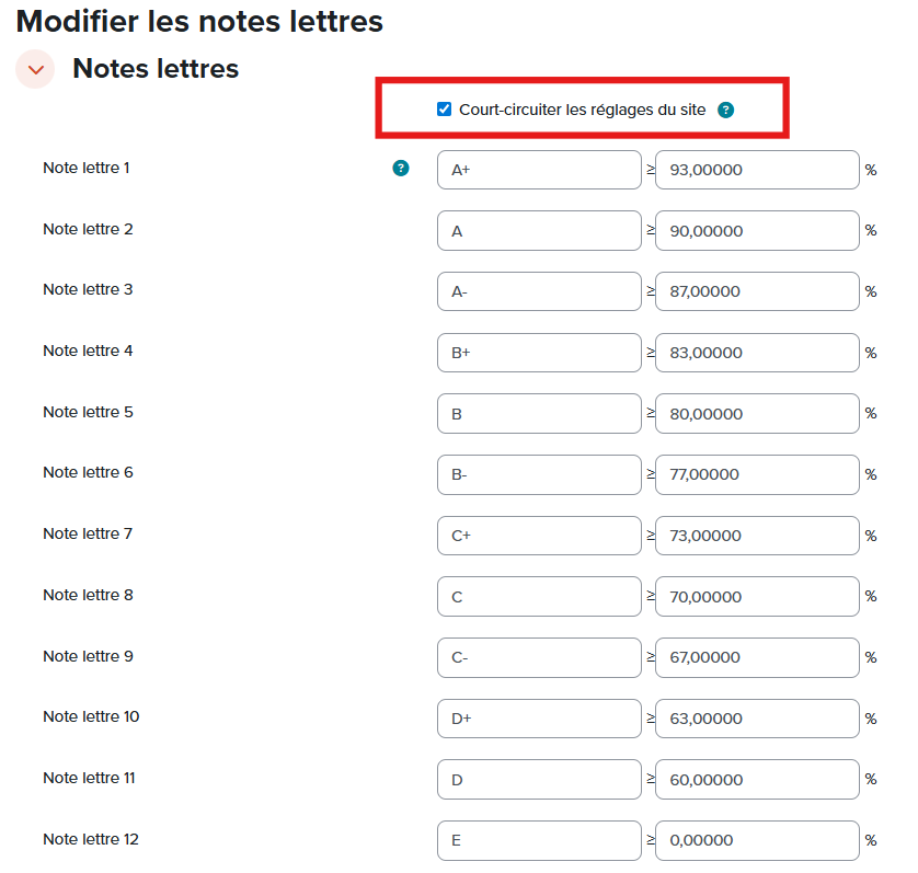 Le type d’affichage des notes et les décimales devraient, normalement, demeurer à Défaut. À moins que vous ne souhaitiez que Moodle prenne en compte davantage de décimales.