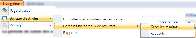 D- Le menu s’ouvre. Sélectionner Banque d’activités, Gérer les bordereaux de résultats puis Gérer les résultats.