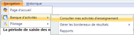 2- Cliquez sur Navigation > Banque d’activités > Consulter mes activités d’enseignement