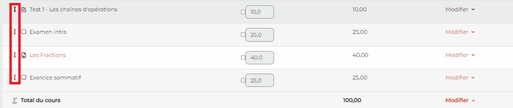 Dans l’exemple ci-dessous, nous trouvons deux activités créées directement dans le cours: un test (Test 1) et d’un dépôt de travail (Les fractions) ainsi que deux éléments d’évaluation entrés manuellement (Examen intra et Exercice sommatif)