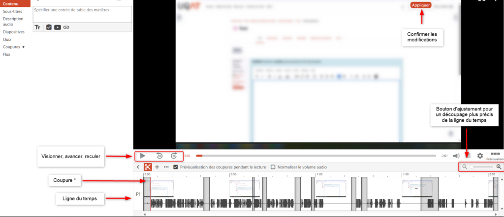 Le temps précis de ces modifications sera inscrit dans «coupures*», situé dans le panneau latéral à gauche de l’écran. Ainsi, il sera possible au besoin de préciser, au centième de seconde près, le temps de la coupure.