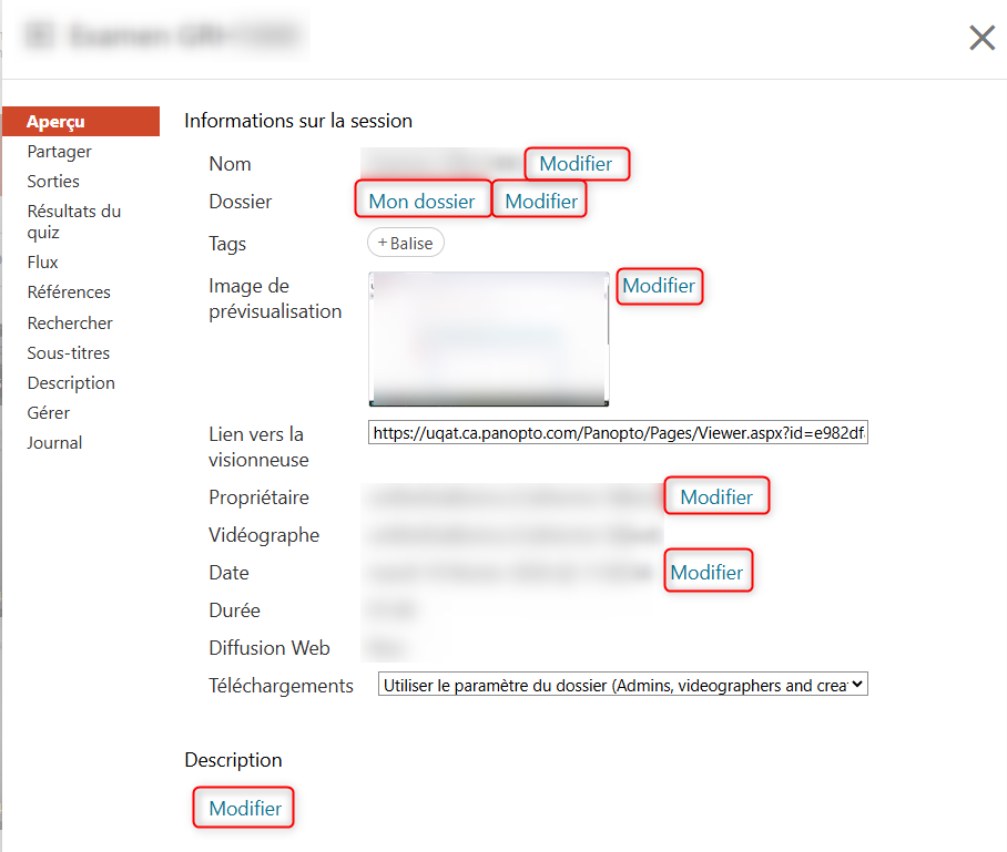 Cette section permet de modifier les paramètres d’une vidéo tels que sa nomenclature, les autorisations d’accès, les dates prescrites pour l’accès au visionnement, l’option de téléchargement, etc. Seules les personnes ayant un rôle «créateur» ont l’autorisation de modifier ces paramètres.