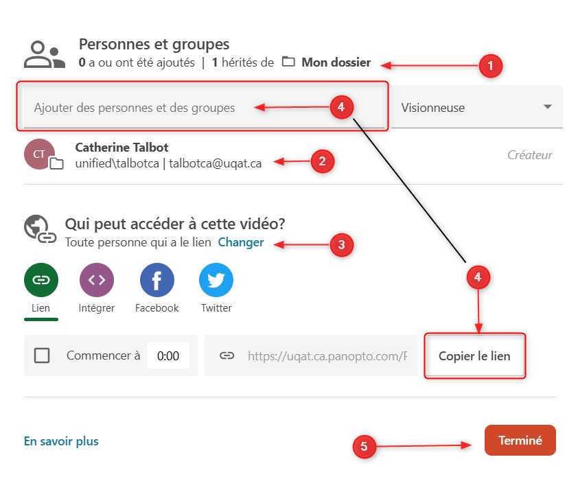 Le partage de vidéos dans Panopto permet de diffuser facilement du contenu multimédia auprès d’étudiant·e·s, de collègues ou de personnes collaboratrices, tout en gardant un contrôle précis sur l’accès et les permissions accordées.