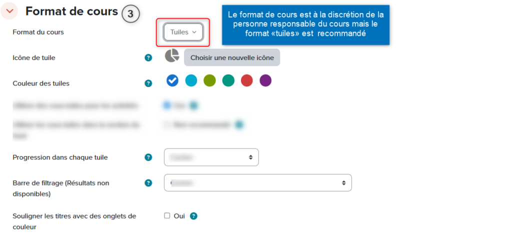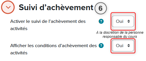 Index de cours : Il permet de situer rapidement une section, une sous-section, une activité ou une ressource. Un indicateur d’achèvement des activités peut également apparaître, si l’option a été sélectionnée dans les paramètres du cours.