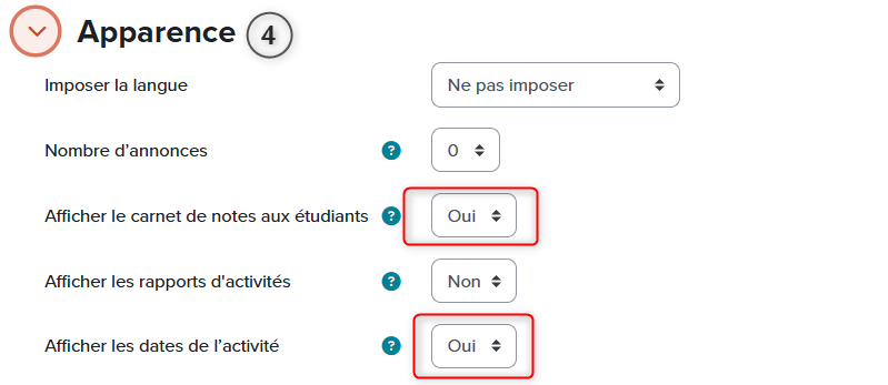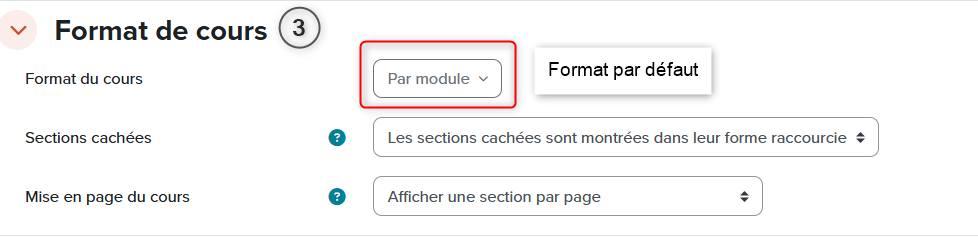 Section : Permet d’organiser le cours par semaine, module, activité, thème, séance, etc. Les sections de cours sont déplaçables et entièrement modelables, selon les intentions déterminées par l’enseignant·e. Le visuel dépend du choix de «format de cours» sélectionné dans les paramètres généraux. (voir sections d’un cours)
