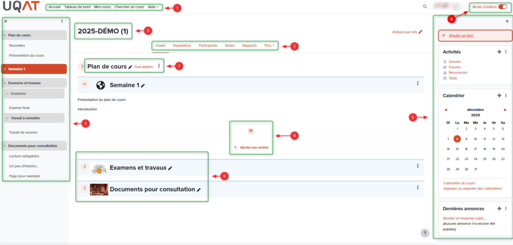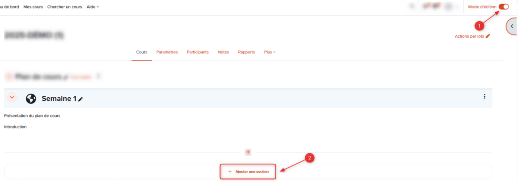 Mode édition :Permet aux enseignant·e·s d’ajouter, déplacer ou modifier les ressources et les activités.