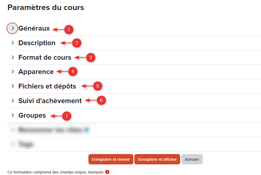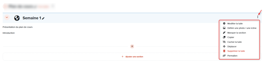 ℹ️ Une section est une unité regroupant plusieurs éléments de contenus (activités ou ressources). Le rôle d’enseignant permet d’ajouter, déplacer, modifier, marquer, cacher ou supprimer une section.