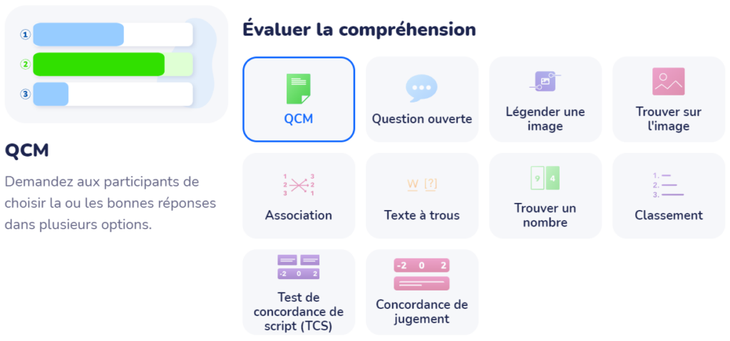 Wooclap est un logiciel de télévoteur qui supporte les activités synchrones et asynchrones. Créez un quiz sur leur plateforme, sur Moodle, ou insérez une activité directement dans votre présentation PowerPoint. Wooclap offre une grande variété de types de questions et la possibilité d’anonymiser les répondants.