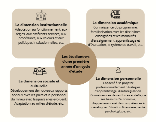 La pédagogie de la première année (PPA) se définit comme le souci institutionnel de réduire les écarts caractérisant la transition interordres, de briser l’isolement vécu par certain·e·s étudiant·e·s et d’établir une solide base pour le développement de leurs compétences transversales et disciplinaires dans une perspective de progression des apprentissages. Les facteurs favorisant la réussite étant multiples, plusieurs dimensions peuvent être touchées, à savoir, des dimensions institutionnelle, académique, sociale et culturelle et personnelle (voir la figure 1). C’est pourquoi une approche concertée entre les différents membres de la communauté universitaire, les différents services et les personnes enseignantes d’un même programme, est fondamentale pour stimuler, chez les étudiant·e·s, l’engagement cognitif et le sentiment de compétence et d’appartenance (comité réussite de l’UQAT, 2025).
