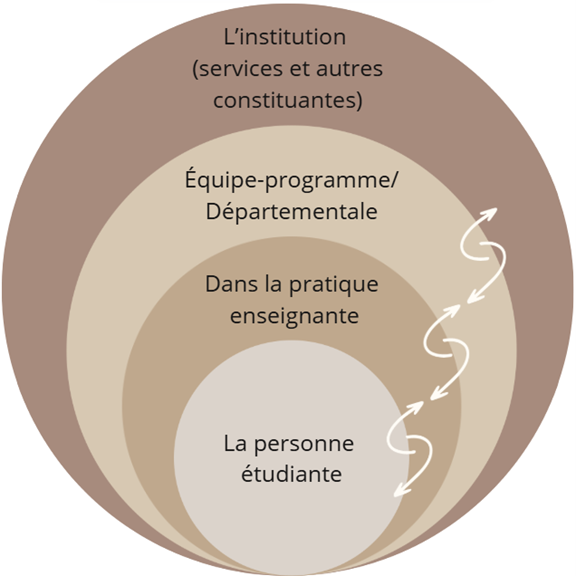 Développer une pédagogie de la première année universitaire dépasse le cadre de la classe. En effet, soutenir la réussite étudiante, et ce, dès la première année d’un cycle, doit faire l’objet d’une responsabilité partagée. Autrement dit, soutenir et favoriser l’expérience d’apprentissage de qualité des personnes étudiantes est l’affaire de tous et toutes. Les prochaines sous-sections permettront de donner des exemples d’action favorisant la réussite étudiante, dès la première année d’étude d’un cycle, et ce, à l’échelle institutionnelle, départementale et de la pratique enseignante.