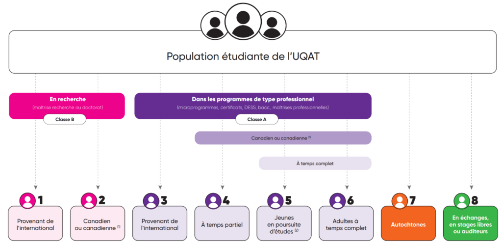 La population étudiante de la classe B provient de l’international ou du Canada et correspond aux profils 1 et 2. La classe A, quant à elle, regroupe des personnes provenant de l’international d’une part, et du Canada d’autre part. Parmi les Canadiennes et les Canadiens, on distingue l’effectif à temps partiel, les jeunes arrivant du cégep et poursuivant leurs études à temps complet, ainsi que des adultes en retour aux études (toujours à temps complet). Ces profils, numérotés de 3 à 6, représentent 60% des inscrits à l’UQAT.
