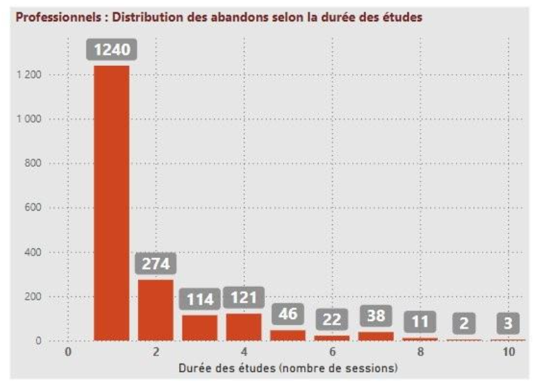 Puis, on remarque également que les étudiant·e·s à temps partiel sont celles et ceux qui abandonnent le plus leur projet d’étude, soit en abandonnant dès les premières semaines, soit en ne se réinscrivant pas à une session ultérieure.
