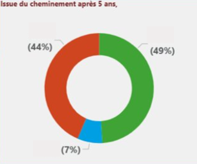 Dans la figure 4, on peut constater qu’après 5 ans, 49% des étudiant·e·s ont obtenu leur diplôme.