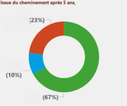 Le pourcentage en vert démontre le taux de personnes diplômées (ou en voie de l’être), en rouge il représente le taux d’abandon alors qu’en bleu nous retrouvons le taux de personnes ayant changé de programme.