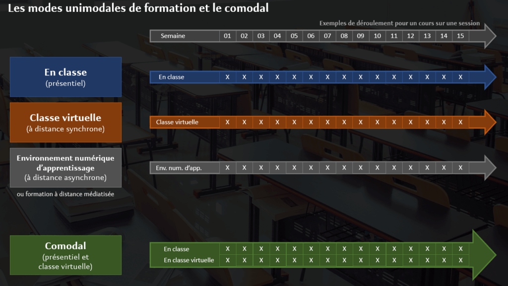 La formation comodale se caractérise par un enseignement offert simultanément en présence et à distance (Lafleur et Samson, 2017). Généralement, en mode comodal, la personne enseignante est présente en classe. De plus, les équipements audiovisuels (caméra et micro) disponibles dans la salle de classe permettent la diffusion de la séance de cours par le biais d’une application de visioconférence (classe virtuelle), par exemple Zoom, Teams ou Via. Les étudiantes et les étudiants peuvent donc choisir de participer au cours en se présentant physiquement sur le campus (en présentiel) ou en participant en ligne (à distance).