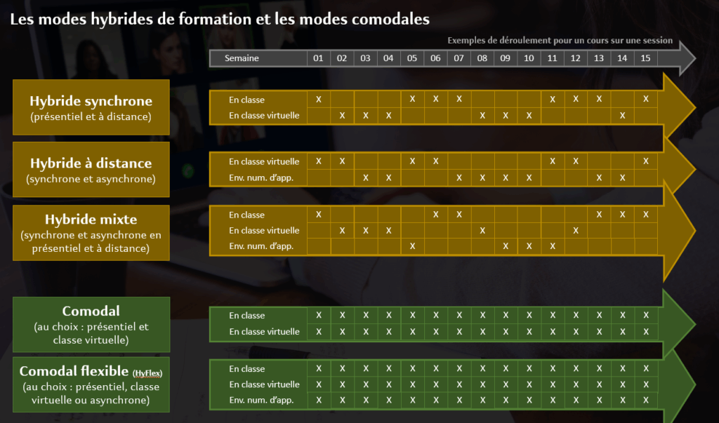 Le cours hybride se distingue du mode comodal par le fait que le mode de formation est déterminé par l’enseignant. Dans un cours hybride, le mode d’enseignement n’est pas au choix, mais plutôt en alternance planifiée. (ex.: en présentiel ou à distance synchrone, en présentiel ou à distance asynchrone, etc.). Bref, c’est la personne enseignante qui choisit le déroulement du cours (plan de cours).