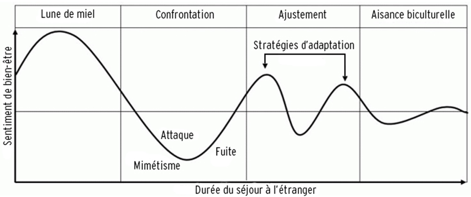 Au début du séjour, le bien-être est grand. C’est l’excitation de la découverte. Quand la routine s’installe, elle s’accompagne souvent d’émotions négatives. La personne est irritée par des éléments de la culture locale, elle s’ennuie de son pays, elle a perdu ses repères et se sent seule. Elle s’adaptera ensuite graduellement, jusqu’à se sentir à l’aise dans sa nouvelle communauté si le séjour est assez long.