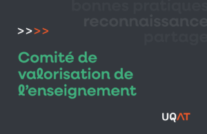 Le comité de valorisation de l’enseignement a pour mission la valorisation et la reconnaissance du personnel enseignant, de l’enseignement et de la formation, et le développement des connaissances et compétences en pédagogie universitaire à l’UQAT.
